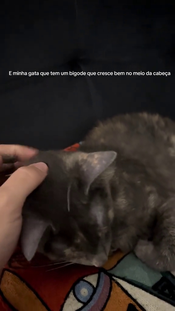 No caso dessa gata, a genética apresentou uma variação incomum, fazendo com que um desses fios nascesse em um local totalmente atípico, entre as orelhas.