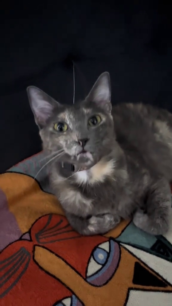 O movimento do "pelo solitário" conforme a gata mexe a cabeça cria uma cena divertida, reforçando a impressão de que o animal carrega um acessório natural de comunicação.