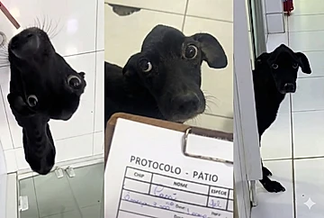 Nos vídeos publicados por Julia, ele aparece frequentemente espiando a veterinária. Às vezes, atrás de uma gaiola, apenas um olhinho preto visível.