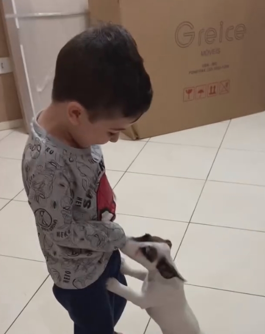 No vídeo, Théo, que na época tinha três anos, abre a caixa com expectativa. Quando percebe que ali está uma filhote de quatro patas, sua reação é de encantamento.