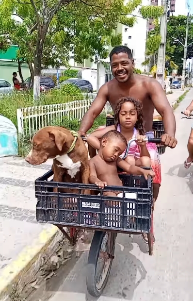 No vídeo, as crianças aparecem acomodadas na bicicleta do pai, todas visivelmente esgotadas.