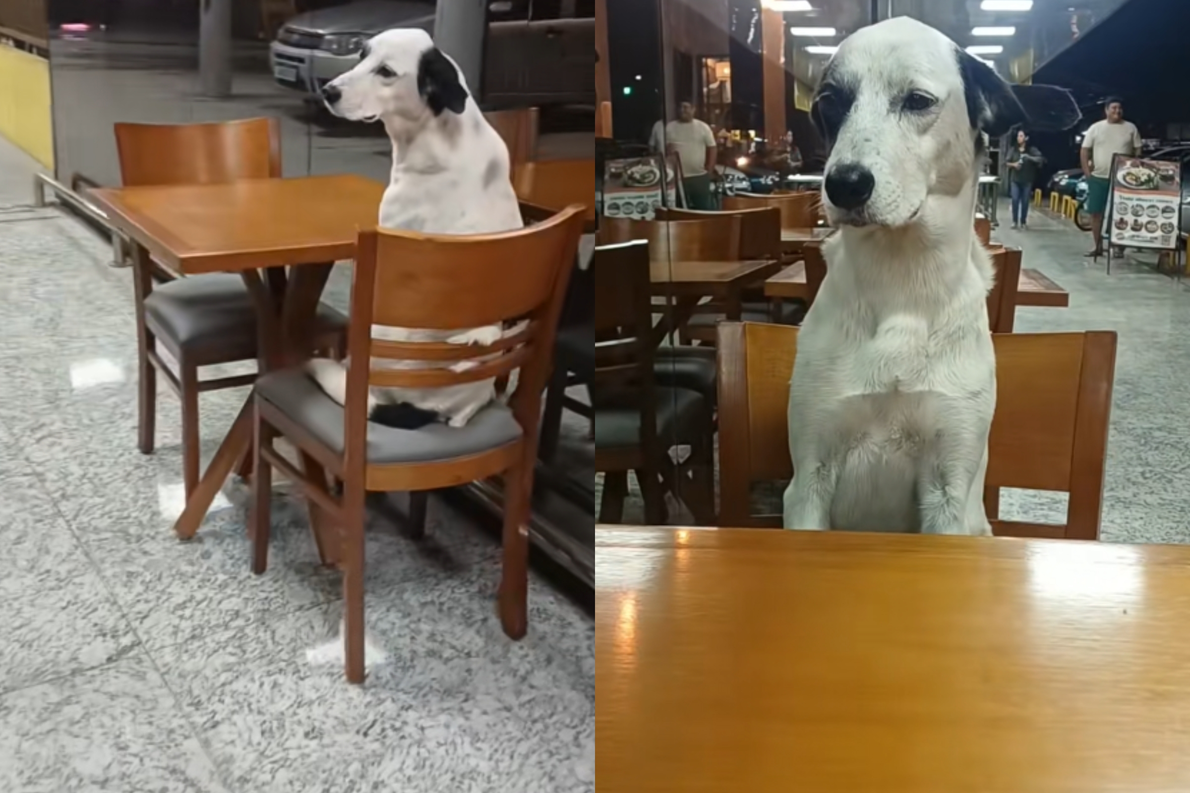 Em vez de ficar na porta ou rondando as mesas, o cachorro simplesmente sentou em uma cadeira. E esperou.