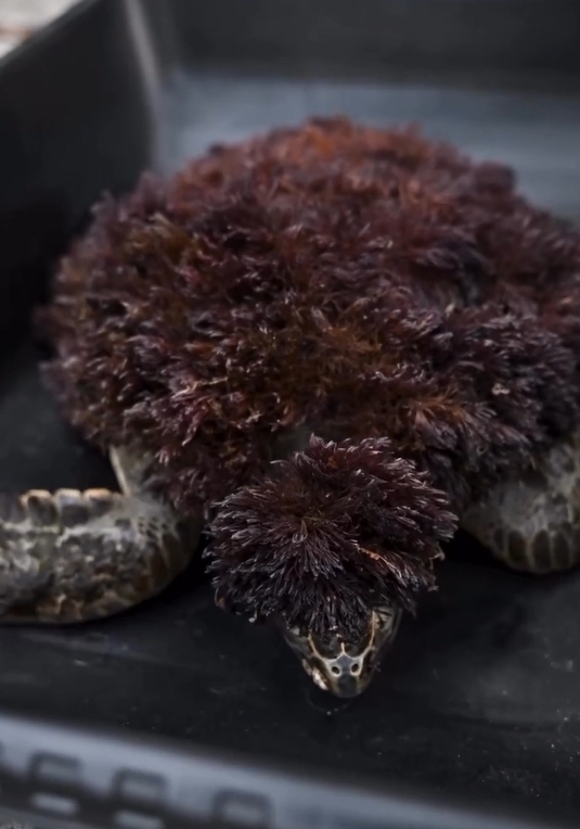 O que recobria o casco e a cabeça do animal era um denso acúmulo de algas vermelhas, indicando que ele permanecia à deriva havia bastante tempo.