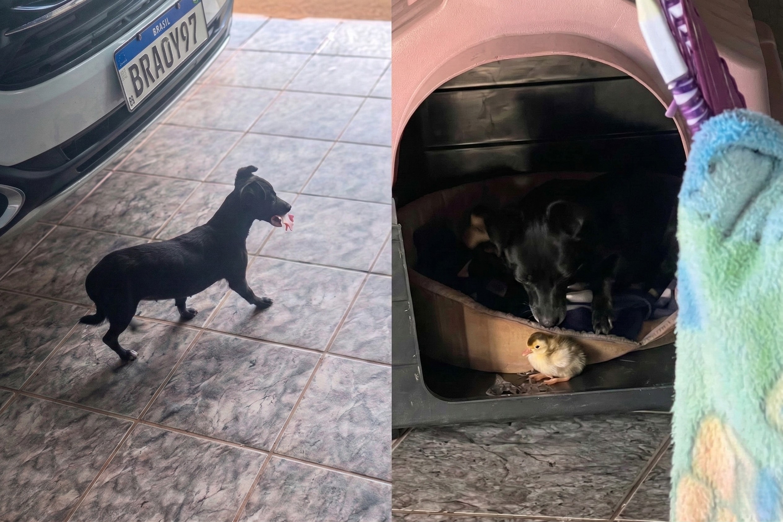 A partir daí, nasceu uma amizade improvável — e extremamente fofa. A cachorrinha passou a tratar a ave como se fosse um filhote precioso.