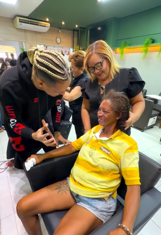 Leandro então levou a senhora a um salão de beleza, onde, pelas mãos de profissionais, ela pôde receber cuidado, atenção e carinho.