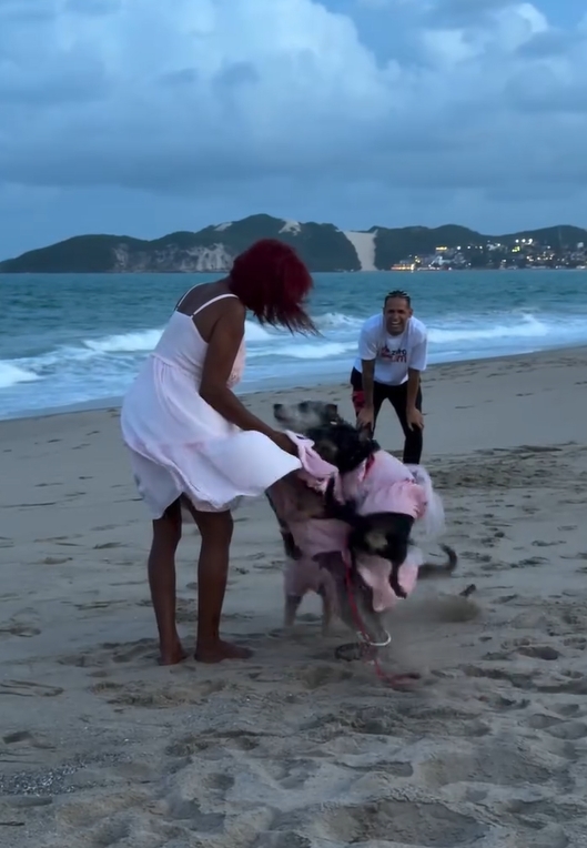 Assim como ela, os três companheiros também haviam passado por uma verdadeira transformação. Além de estarem limpinhos, cheirosos e bem cuidados, os cães apareceram usando um look rosa cheio de estilo, que deixou a cena ainda mais emocionante e divertida.