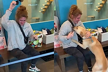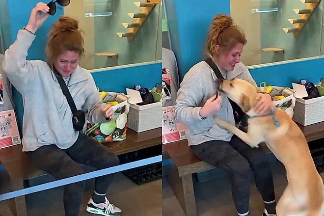 Choramingava, pulava e lambia o rosto dela repetidamente enquanto ela o abraçava emocionada.