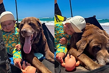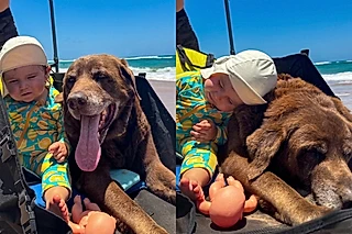 Em um passeio tranquilo pela praia, um cachorrinho idoso mostra que o amor não tem idade ao se tornar o companheiro inseparável de uma bebê
