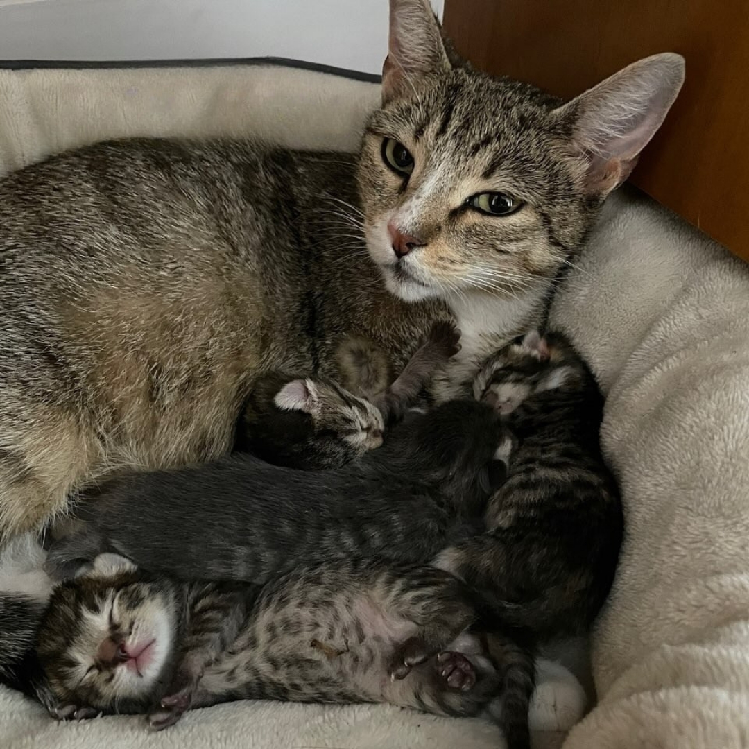 Mas o resgate de Frances não foi qualquer resgate. Graças a ela, hoje Chris é tutor de oito gatos. Isso mesmo — quando foi acolhida, ela já estava grávida.