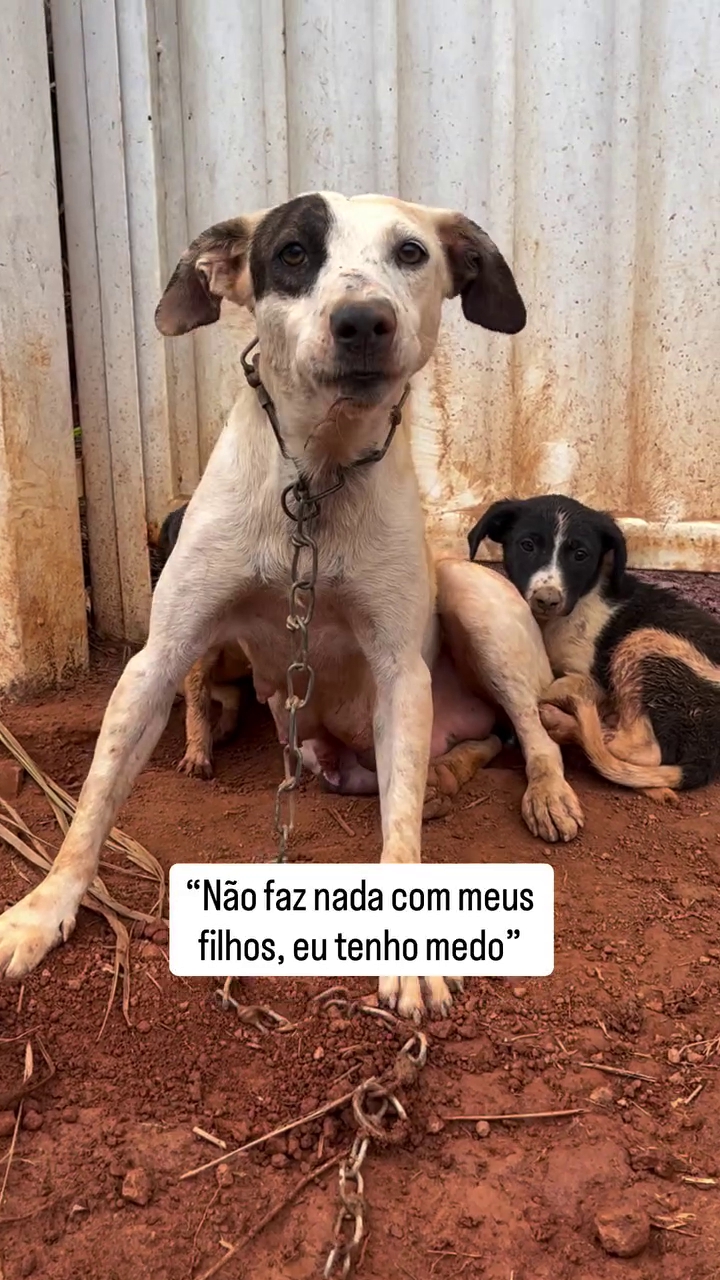 No momento da abordagem, a mãe apresentava comportamento defensivo e latia para proteger a ninhada, mas demonstrou confiança após receber alimento e abrigo.