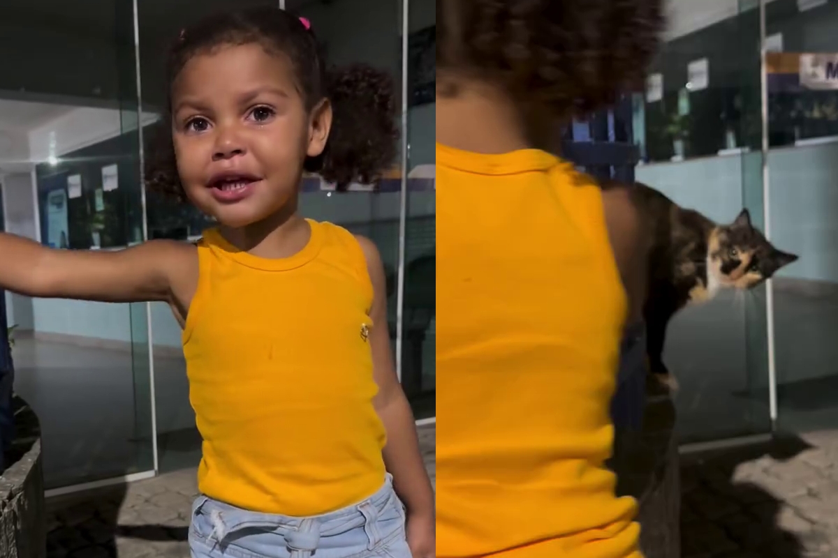 O registro mostra o momento em que a pequena encontra um gato em uma calçada e inicia um diálogo com os pais sobre a situação de vulnerabilidade do animal.