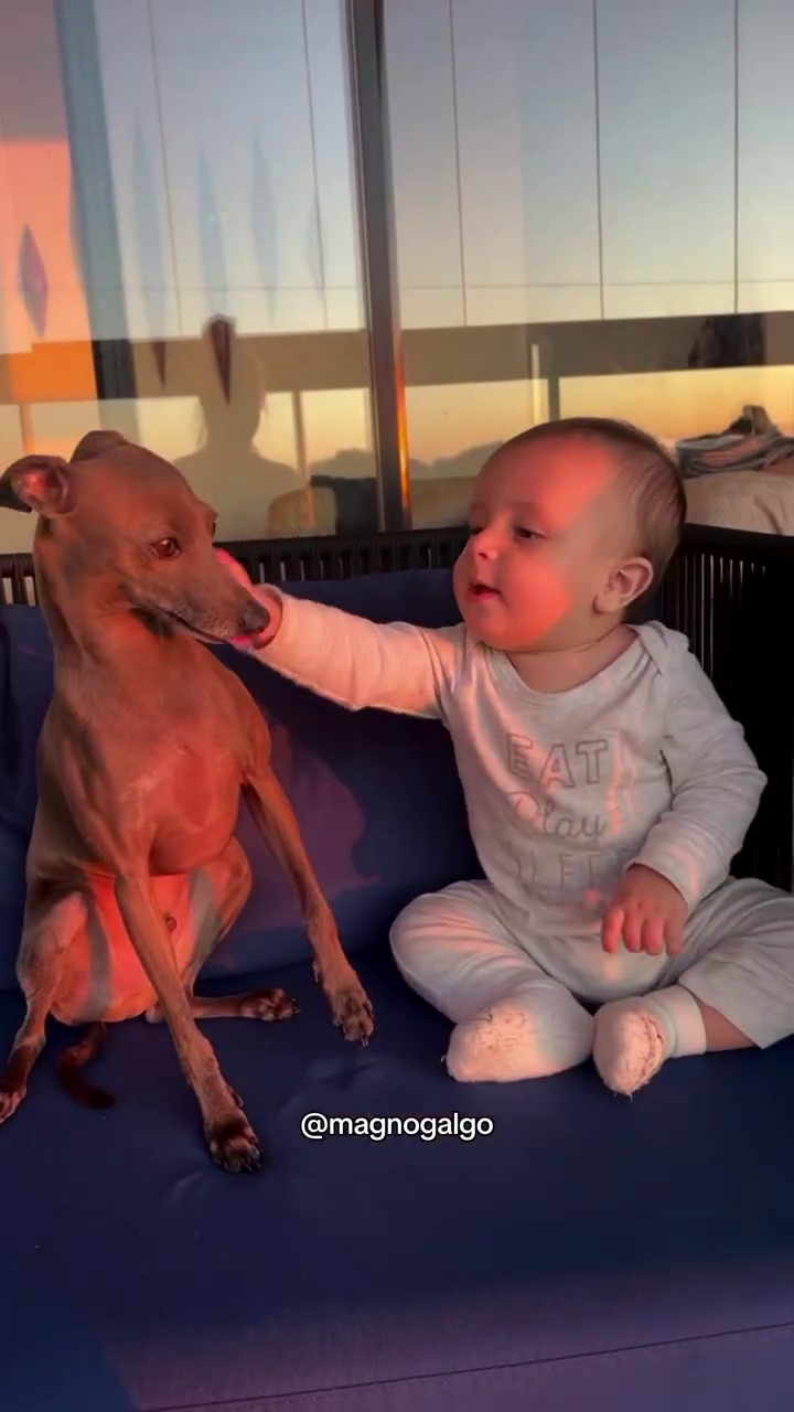 A sincronia entre os dois é tamanha que o vídeo registra o momento em que a mão da criança e a pata do galgo se encontram no sofá, em um gesto de companheirismo que resume a tese da amizade interespécie.
