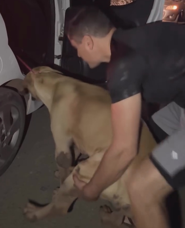 Com paciência e ajuda, os voluntários conseguiram colocá-lo no carro. Mas o desafio estava apenas começando.