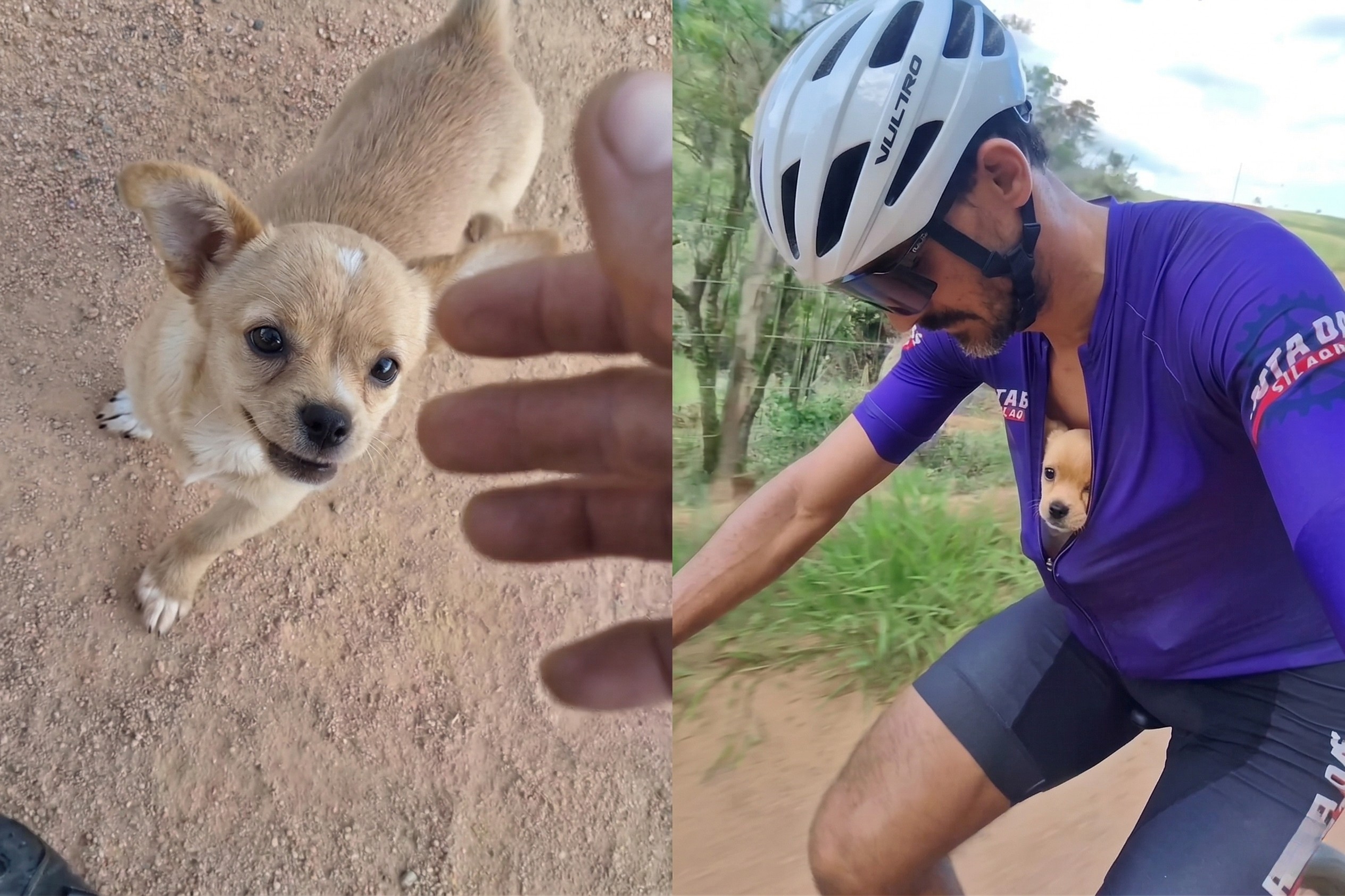“Ao ver aquele olhar, ele abriu a camiseta e a colocou junto ao peito”: Filhotinha resgatada muda vida de ciclista para sempre