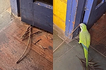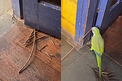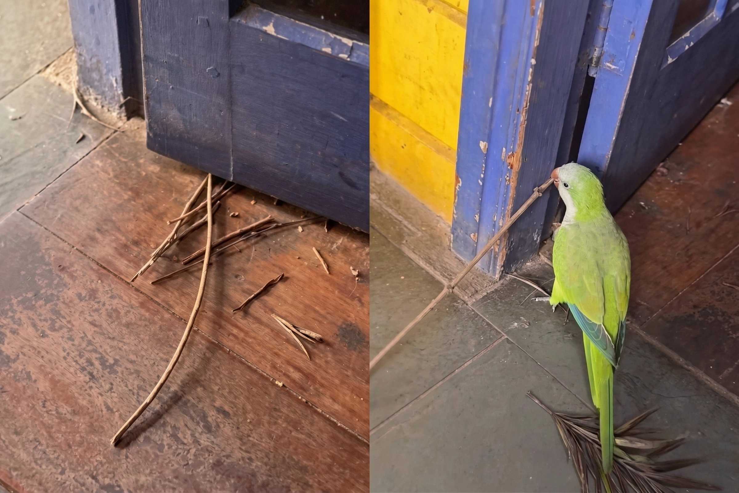 A querida começou a levar galhos e pequenos pedaços de material para montar seu ninho atrás da porta. E, com isso, a rotina de Larissa passou a incluir um novo “ritual”: retirar tudo e levar para longe.