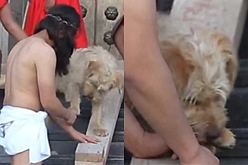 O momento mais marcante aconteceu quando o ator caiu sob o peso da cruz. Sem hesitar, o cachorro se aproximou novamente e, com delicadeza, lambeu seu rosto, oferecendo um tipo de consolo, profundamente significativo.