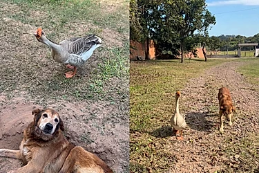 Segundo o relato, o ganso passou a se aproximar do cachorro com o tempo, até que a presença virou rotina. Dois anos depois, a ligação entre eles já não passa despercebida.