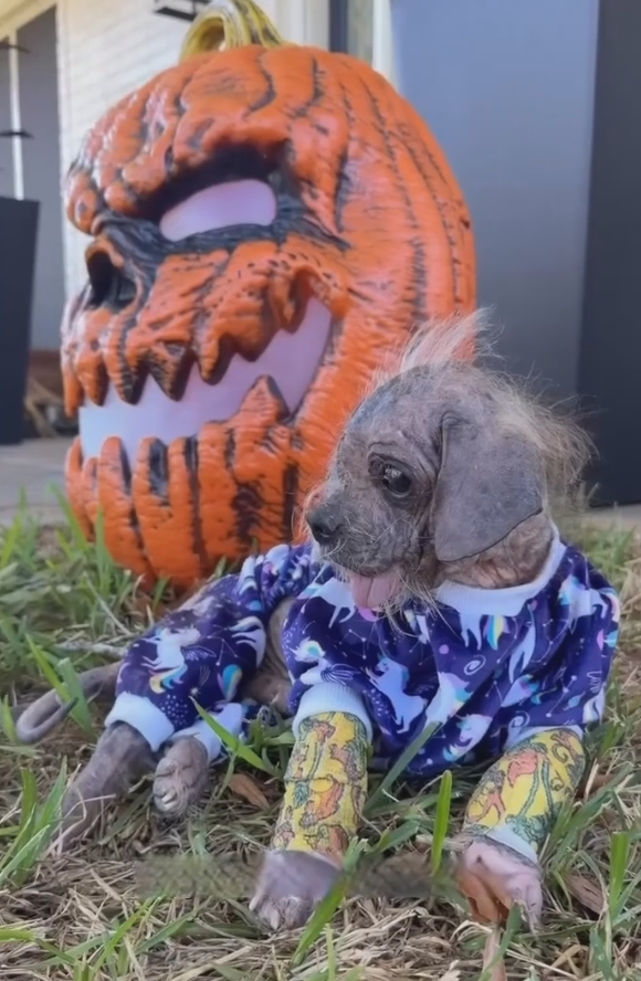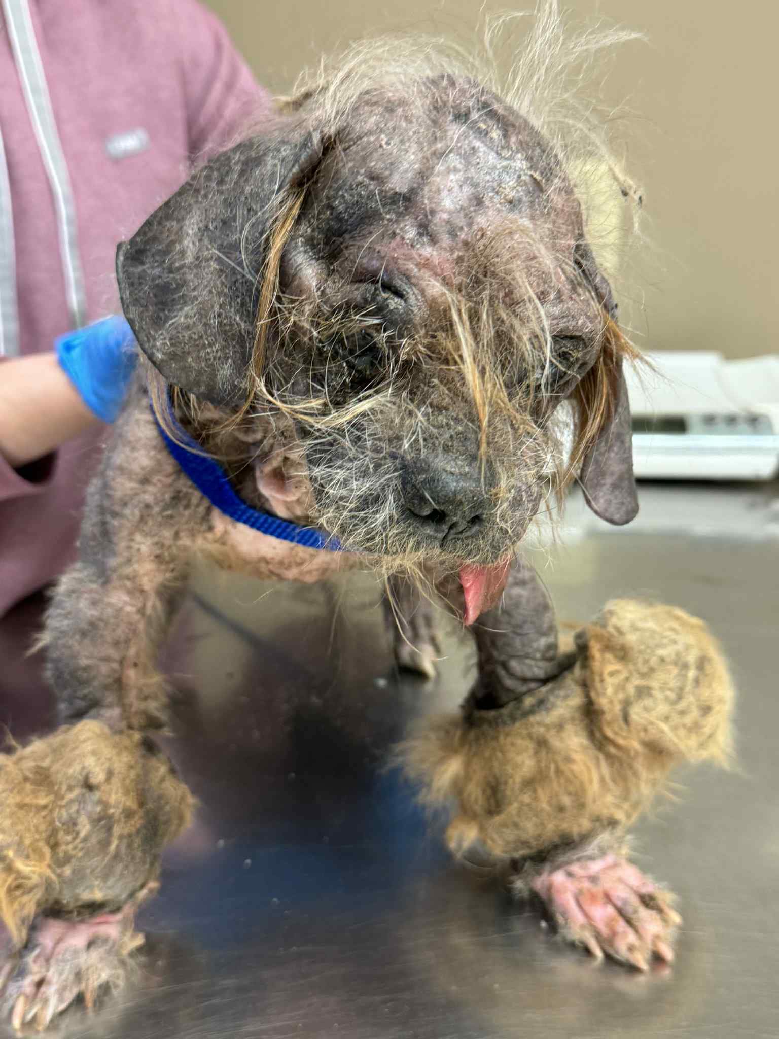 O cão estava praticamente sem pelos, e os poucos que restavam estavam embolados em tufos. Por baixo deles, feridas graves se espalhavam pela pele.