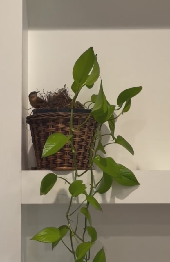 Ao longo do dia, entra e sai carregando pequenos galhos e materiais no bico, organizando tudo com calma. Aos poucos, o vaso decorativo foi ganhando o formato de um lar.