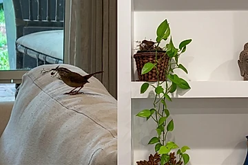 Ao entrar na sala, ela percebeu que não estava mais sozinha. Um passarinho pequeno havia escolhido justamente o vaso de uma planta, aparentemente uma jiboia, para construir seu ninho, bem na estante da TV.