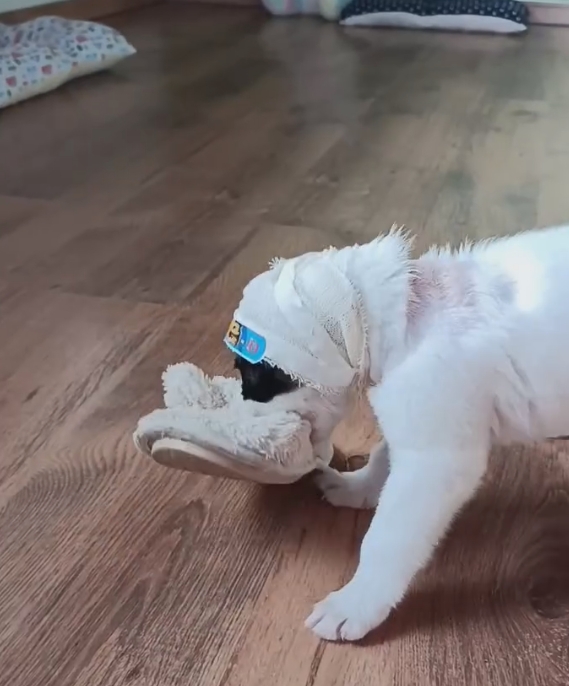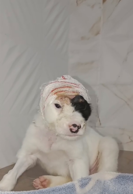 Mesmo debilitado, o filhote demonstrava disposição para reagir. Aos poucos, começou a se alimentar melhor, ganhou força e passou a interagir mais. Ainda com curativos na cabeça, já ensaiava brincadeiras.