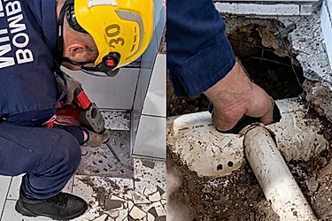 Utilizando ferramentas adequadas e muito cuidado, a equipe fez uma abertura no chão até alcançar o cano onde o cachorrinho estava preso.