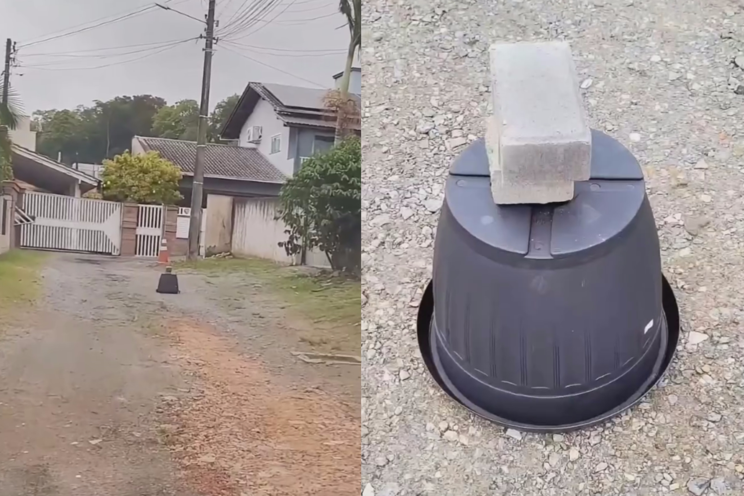 “Tá lá no meio da rua, olha só, colocaram um balde pra prender ele ali. Caraca, colocaram dois tijolos ali em cima do balde”, narrou, enquanto se preparava para descobrir o que estava escondido.
