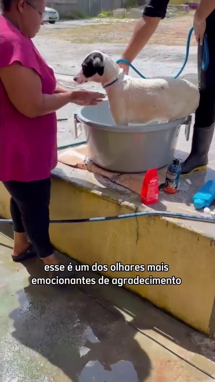 No momento em que recebeu os primeiros cuidados e o banho inicial no abrigo a cadela reagiu com atenção fixa e contato visual direto com a equipe de salvamento.